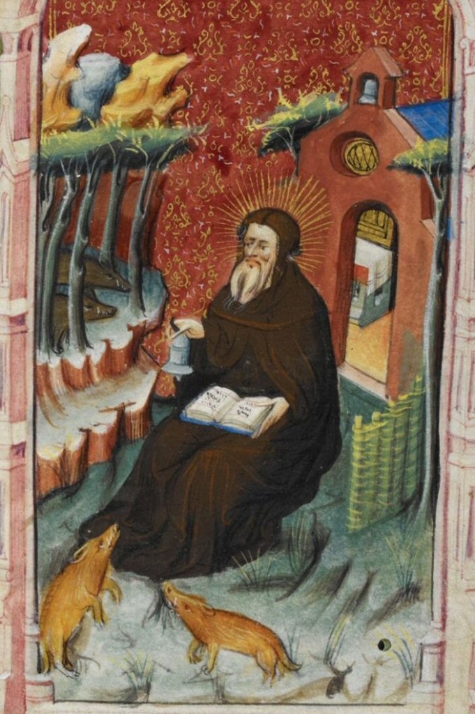 The decision to put things under the care of the saints is one that is being slowly implemented. We’re still praying to find the right saint for our nursery/orchard/business. Actually, we’re still seeking saints for just about everything. All last year, I prayed over a saint for the pigs, and I ended up choosing St. Anthony the Abbot. I was a little reluctant because the connection seems a bit tentative to me he kept coming to my attention. Anthony the Great is depicted with a pig, and there are several explanations. Some say it is representative of his battles with the devil, others say that it was due to a pig helping him keep track of the hours, and yet others say that it is because he is known as the patron of those with skin diseases (particularly ergotism, known as St. Anthony’s fire) as they were often treated with lard to help reduce inflammation. The Hospitallers of St. Anthony associated with him also raised pigs or kept them in order to have the lard to treat others with skin disease. Another story says that St. Anthony cured a pig and befriended it. Whatever the truth behind the connection, we are seeking his intercession for our pigs.