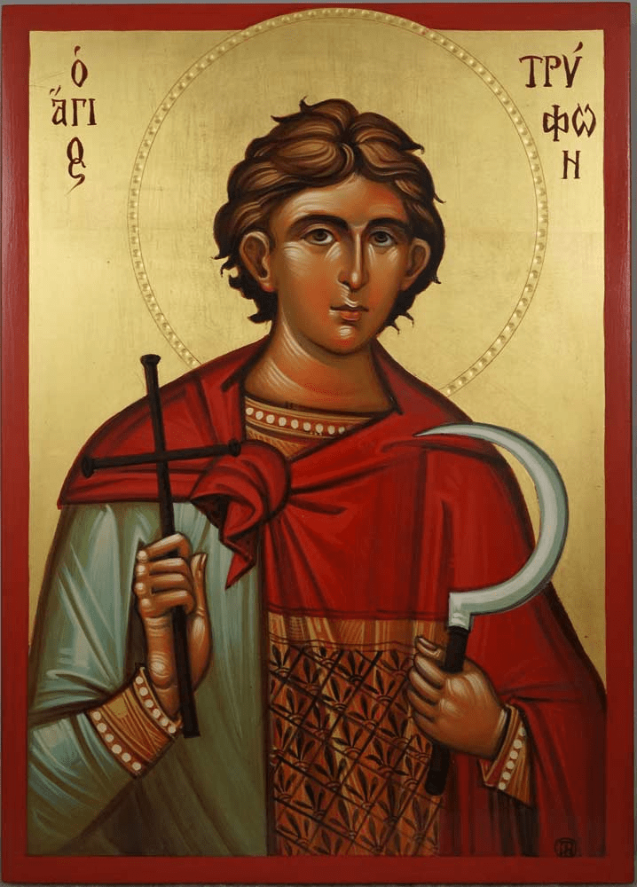 From Phrygia, St. Tryphon was born during the mid 200s. He was well-known for miracles of healing, including the healing of the empress’s daughter. Eventually, he was beheaded for being unwilling to denounce Christianity, under the persecution of Decius. He is known as patron of winemakers and vinedressers because he is said to have repelled a plague of locusts from a vineyard. The grape farmers were, of course, grateful for the protection that Tryphon provided. For this reason, he one of the primary patrons of vinedressers and winemakers.