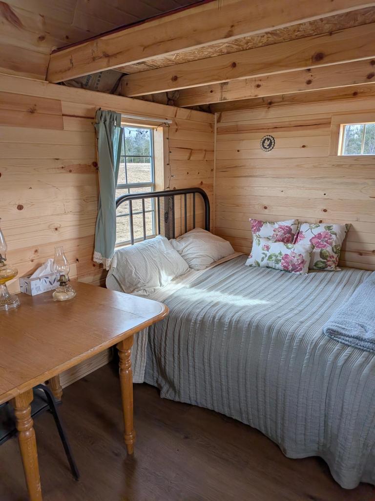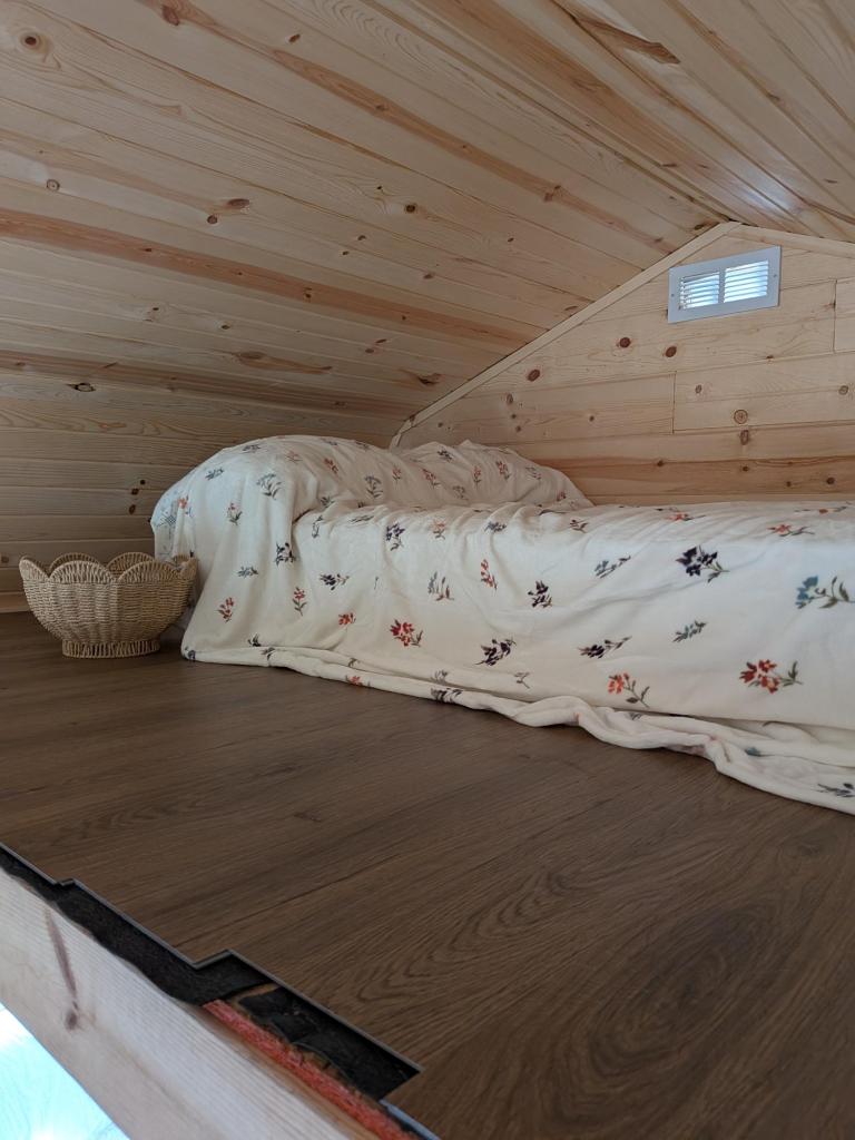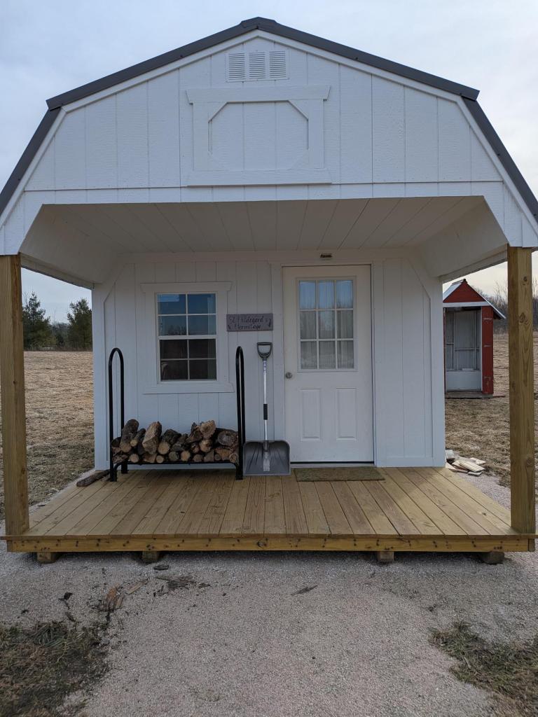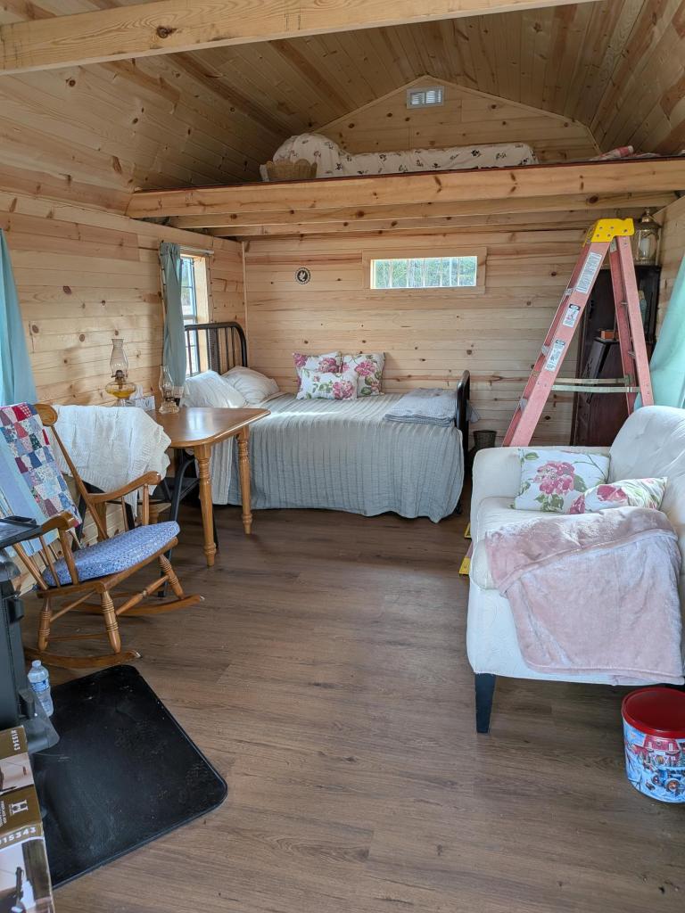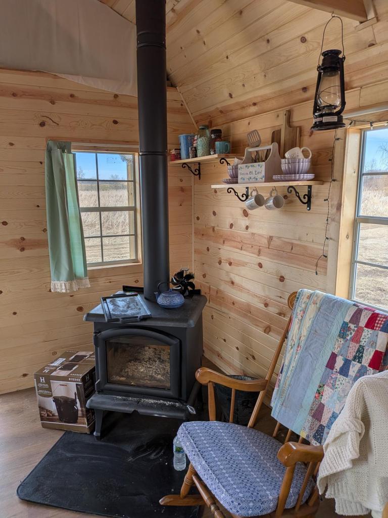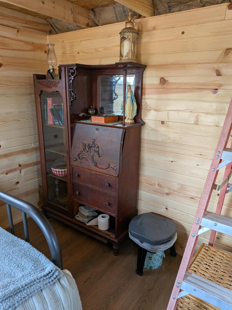 We’ve accumulated supplies throughout the years that would serve us well when we decided to put the cabin up on the property. Many things, like the bed and the writing cabinet, we were able to get free. We’ve built up a collection of kerosene lamps throughout the years, as well as other odd supplies for off-grid living, in the event something goes wrong, like an extended power outage. We built the outhouse with scrap material years ago so I would have a place to go to the bathroom when working out in the fields, but it hadn’t been used much recently, so we moved it next to the cabin. Other supplies, like most of the blankets and pillows, I acquired in the months leading up to the cabins arrival, and nearly all were purchased at steep discounts, and I was able to use fabric from my stash to make curtains and pillow covers. We actually had a woodstove in storage for years that we could have used, but after assessing the space, decided to get a new one, but purchased the clearance model from the store. We hired my dad to install the woodstove, but the rest of the work was done by us. There are actually two lofts in the cabin: one above the queen bed, and one above the porch. The one above the porch is used for storing additional supplies.