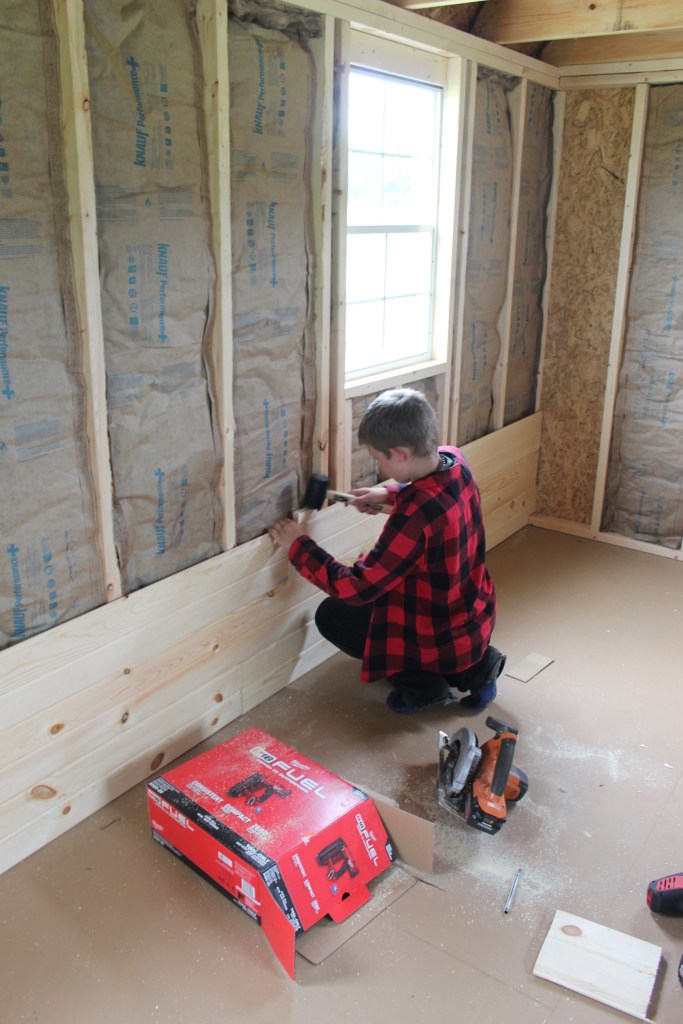 Once the shed was installed, we got to work on the inside. I mostly worked on it one or two days a week for a few weeks, as I had other responsibilities to care for between the kids and the garden harvest. We insulated and finished the walls and ceiling with tongue-and-groove boards, and sealed everything with a clearcoat. We used vinyl flooring for easy cleaning, and installed a fire board and had a woodstove installed. There are still a few finishing details, but right now it’s fully functional. We furnished it mostly with free furniture from family and strangers. As I began to assemble everything and spend some time out there, I knew I needed to have it be a little cozier than any hermitage or poustinia, but simplicity has been the rule.