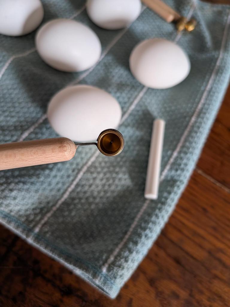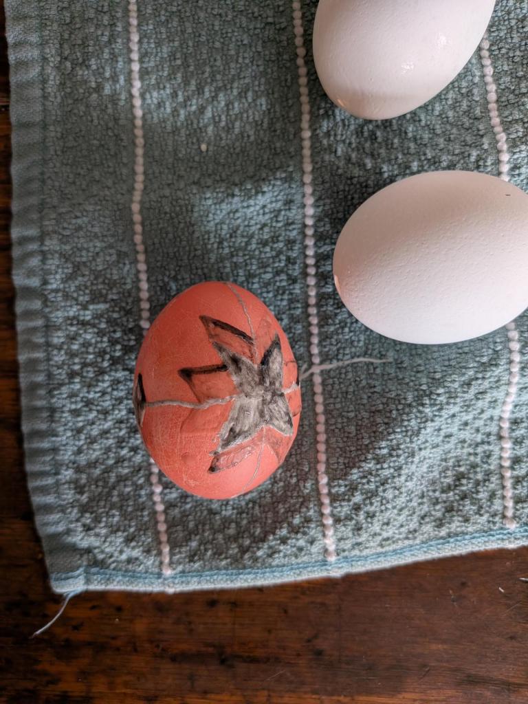 My first attempts at this are not the most beautiful. There’s a bit of a learning curve to getting the stylus of the kistka heated just right. Too hot, and the wax will pool off the tip when it touches the egg, rather than dragging a line. Too cool, and it won’t draw, or the lines will be too thin or not adhere well. The stylus was loose in the loop that holds it to the handle of the tool (I wasn’t able to tighten it), and so I had to figure out how to secure it so it would remain steady, otherwise the tip wobbled and made wonky lines. I used my finger nail to scrape the wax off, but you do need to be careful scraping. Too hard, and you can scratch off other layers. Too much dye will start to removed dye from the egg, so you might be limited in how many colors you can end up doing. If you are melting any remaining wax off the eggs, the flame can leave a black mark on the egg that won’t wash off if you hold the egg too close to the flame or over it for too long. Heat it for short bursts, and wipe immediately with a paper towel or a cloth. I feel that future endeavors will be much more successful as I adjust to the process.
