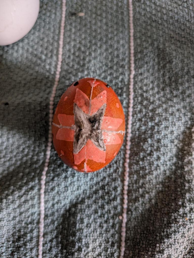 For example, if I want white areas on my egg, those are covered with wax first, and then the egg is dipped in the color I want next, potentially yellow or orange. More wax is added over the yellow, the egg is dyed again… and so on and so forth. This can be done progressively in the same color to deepen the shade of the color. For example on my first real attempt at this, I used red dye and left it in the dye longer and longer. On the final dip, I added a bit of black to the dye to deepen the color even further. If multiple layers are done, the final color of the egg dye is either naturally already quite dark, or it is dipped in black dye on the final dipping before the wax is removed. Then the wax is melted off (by holding it carefully over a flame) and wiped clean. Though I have seen many elaborate colorings, many of the eggs I have seen are simply white or brown eggs with a single layer of wax added to the egg, and then dyed red.