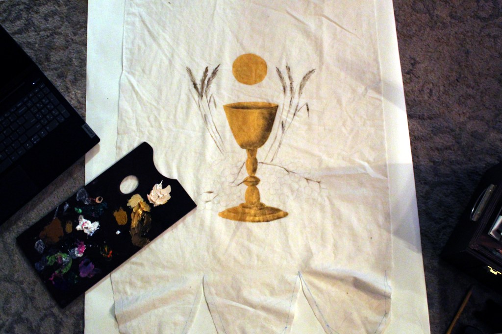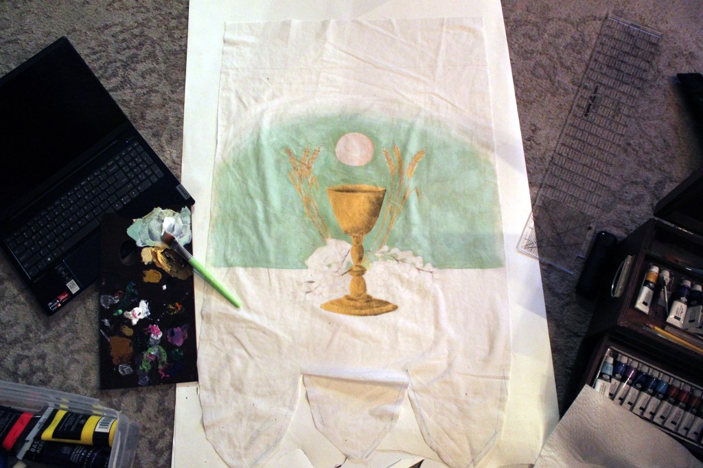 Though this will depend somewhat on the particular design you choose, I recommend beginning with the background, and then painting on the design. It is easier to paint details over a finished background than it is to cut in the background color behind fine designs. However, on the chalice banner that I made, I painted the chalice, first, and cut the background in after. This was easy enough to do, as the chalice had fairly simple edges. I also did this because I hadn’t determined my background color.