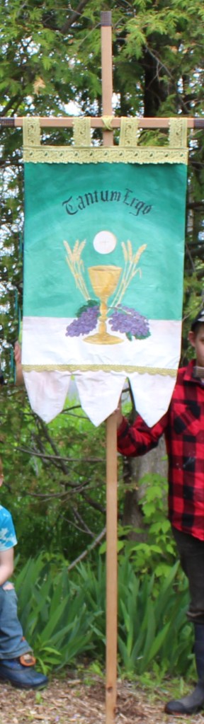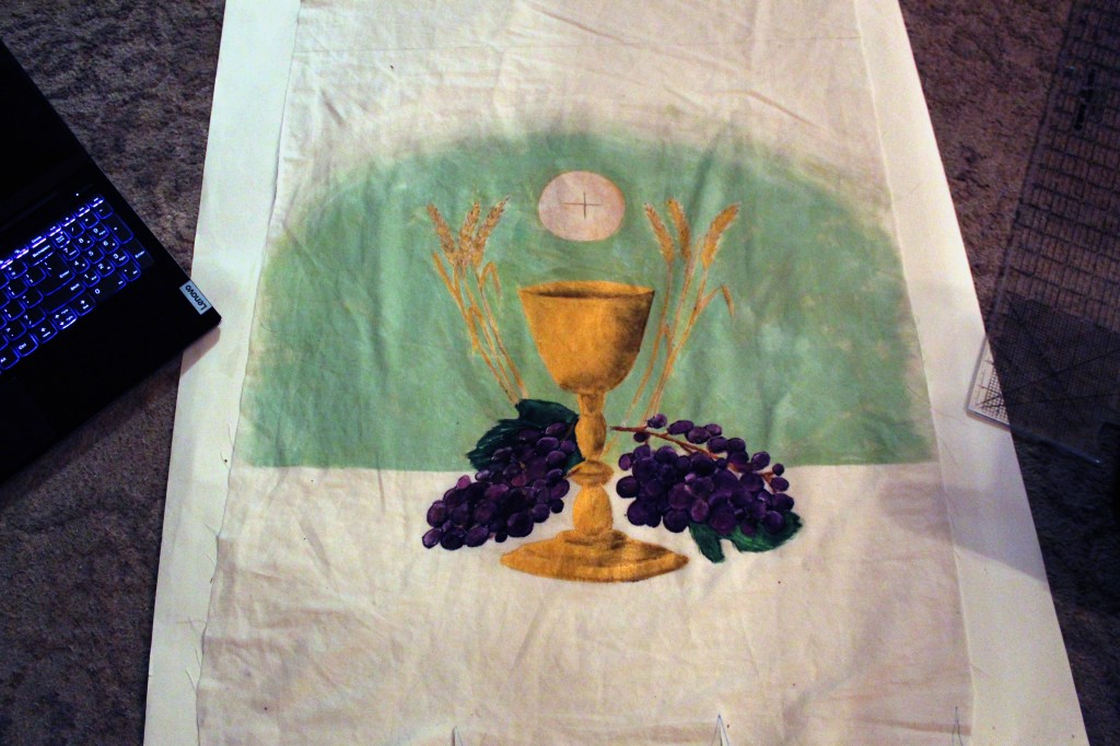 Processional banners for faith-related events are typically fille with symbols of the faith that are important to the family, group, or parish. When our parish (and our sister parish) took up the tradition of Corpus Christi processions once again, we no longer had useable processional banners. Being on a time-crunch, and working solo, I decided to make some for our parishes. For the design, I used images that are prominent in each parish that reflect the parishes’ patronage. The second side had the names of the parishes painted on them. For home use, I decided to use the chalice, Host, wheat, and grapes with the words “Tantum Ergo” which are typically sung during adoration. The grapes and wheat are reflective of the agricultural work we do on our homestead. On the other side, I used a picture of my parish’s monstrance, and in the luna (the window), I painted a host with the Sacred Heart on it to reflect a powerful experience I had during the 10th National Eucharistic Congress in 2024. The background color mimics some coloring in a portion of the monstrance, but the blue color is one I have often seen during prayer that makes me think of Mary.