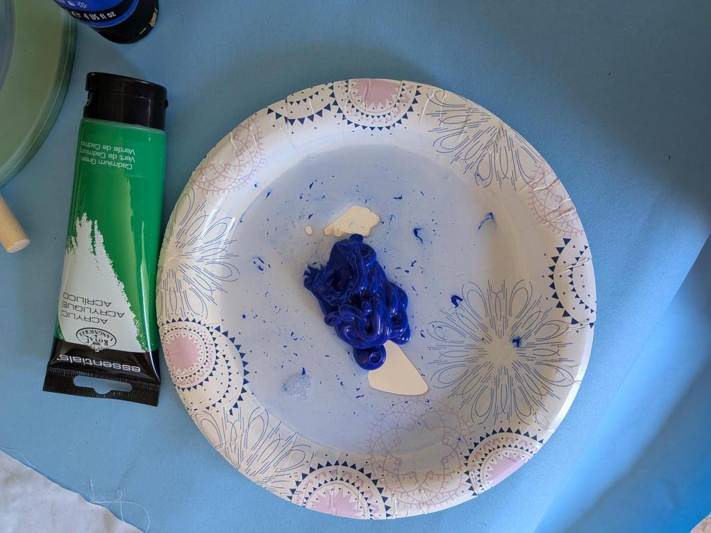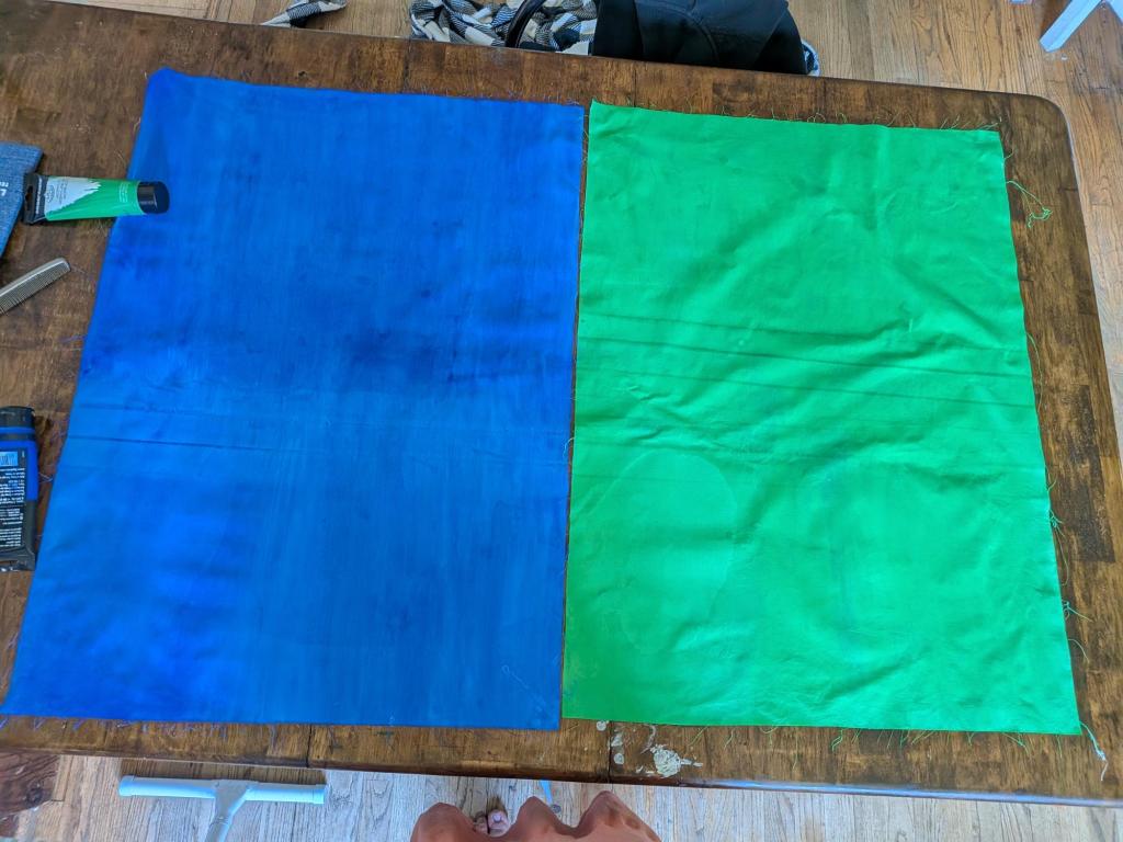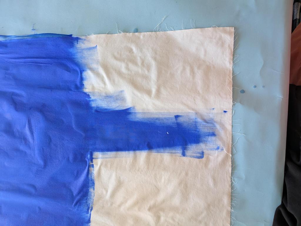 Painting a large area background color can use quite a bit of paint. This can be a good time to use a watered-down acrylic if you want to use materials sparingly, but this will also give you an uneven water-color-type background. It’s really a design preference. Otherwise, make sure you purchase enough of the color you are using (or colors you are mixing)! Spritzing the fabric with a water mist can help it to absorb the paint more readily with a little less of the spreading effect.